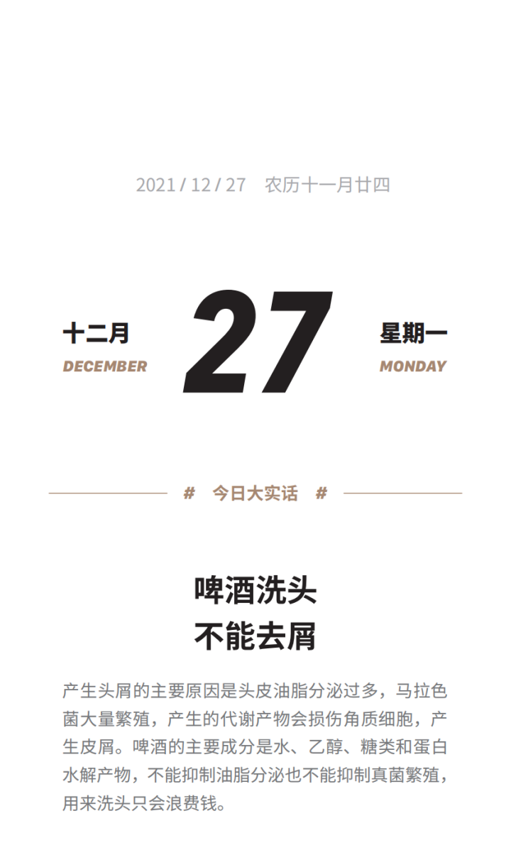 另外,啤酒中的糖类、蛋白水解产物、水溶性的维生素虽然有营养,但不仅不能透过表皮被人体吸收,还可能给引发头屑的马拉色菌提供营养。