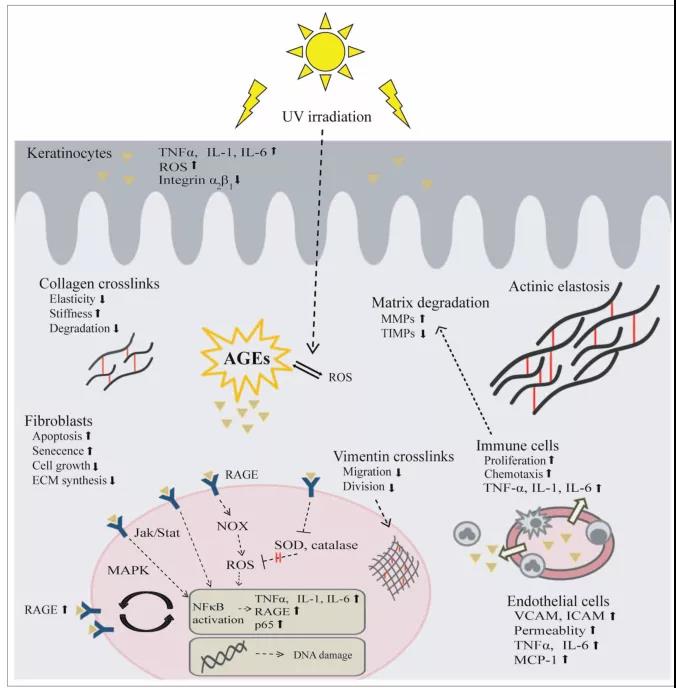 上次和大家聊了,皮肤的衰老和 AGEs 真心是非常密切,要命的是,这个 AGEs 和皮肤中各层的细胞分子都「百搭」;蛋白、脂肪或核酸,一个不放过;改变真皮中相关蛋白的生物物理活性、增加细胞凋亡、诱导氧化应激、诱发炎症反应。